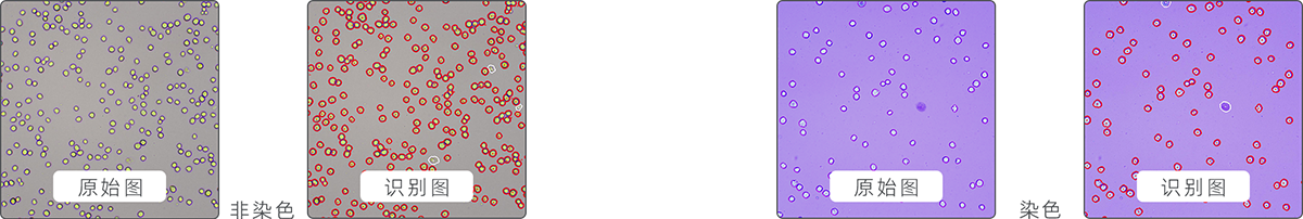 非染色計(jì)數(shù)(發(fā)明專(zhuān)利號(hào):ZL 201310101403.0):無(wú)需染色,直接對(duì)細(xì)胞進(jìn)行計(jì)數(shù)和區(qū)分活死細(xì)胞,適用于狀態(tài)良好、背景干凈的培養(yǎng)細(xì)胞;臺(tái)盼藍(lán)染色計(jì)數(shù):區(qū)分活細(xì)胞和死細(xì)胞的經(jīng)典方法,相比非染色法,色彩變化更直觀。