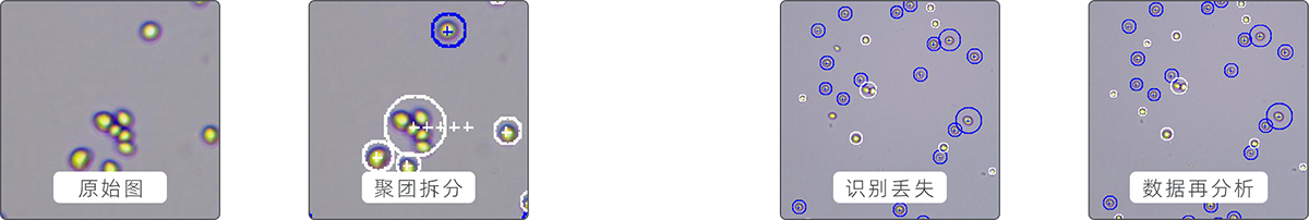 軟件可自動(dòng)識(shí)別細(xì)胞聚團(tuán)現(xiàn)象,確保細(xì)胞計(jì)數(shù)的準(zhǔn)確性;對(duì)識(shí)別出現(xiàn)丟失的數(shù)據(jù),可自定義軟件識(shí)別參數(shù),對(duì)計(jì)數(shù)結(jié)果進(jìn)行再識(shí)別分析(案例細(xì)胞圖為酒酵母)。