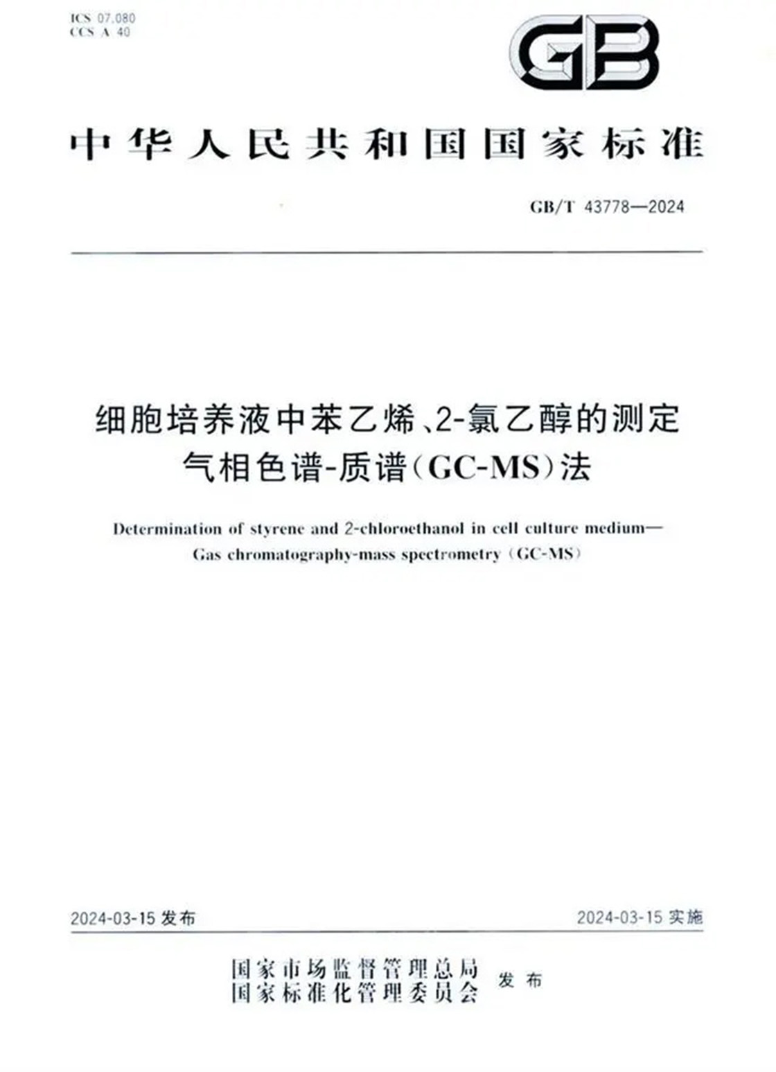 今年3月,國家標(biāo)準(zhǔn)化管理委員會(huì)正式發(fā)布并實(shí)施《細(xì)胞培養(yǎng)液中苯乙烯、2-氯乙醇的測定 氣相色譜-質(zhì)譜(GC-MS)法》(GB/T 43778-2024)。為細(xì)胞培養(yǎng)產(chǎn)品的質(zhì)量控制提供了更為科學(xué)可靠的依據(jù)。