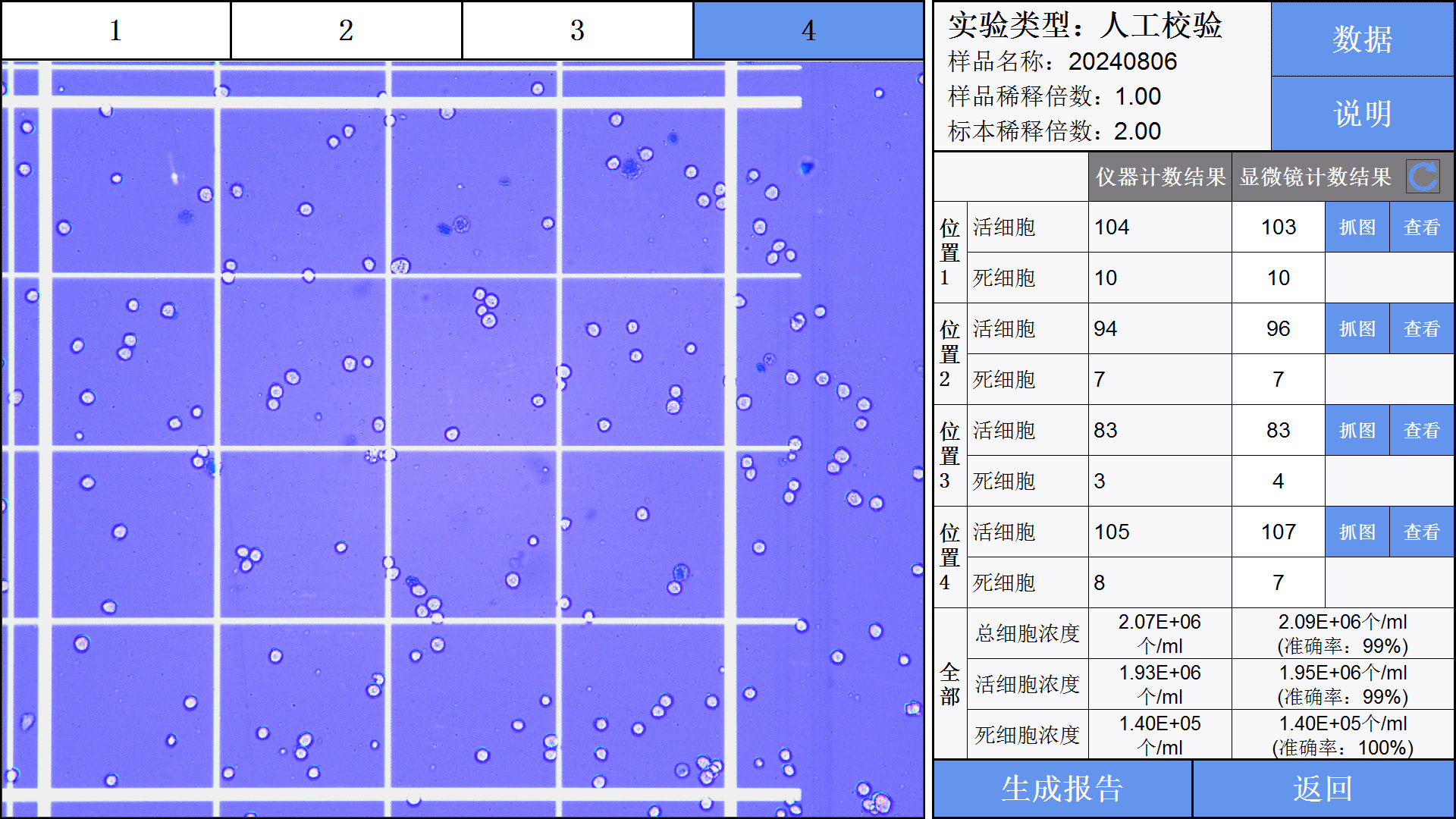 2-儀器計(jì)數(shù)完成,將血細(xì)胞計(jì)數(shù)板從儀器的載物臺(tái)中取出,放置在第三方顯微鏡下,對(duì)同一孔位樣品進(jìn)行人工計(jì)數(shù),將人工顯微鏡下的計(jì)數(shù)結(jié)果輸入儀器人工校驗(yàn)界面的表格中,即可得出儀器的準(zhǔn)確率。