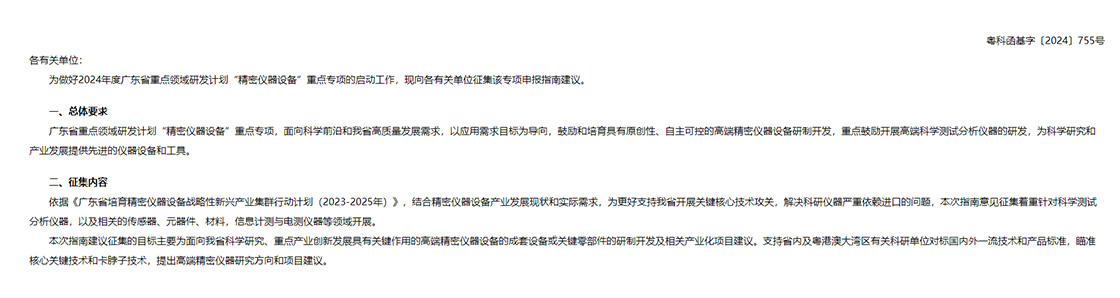 今年6月,廣東省科學(xué)技術(shù)廳發(fā)布關(guān)于征集2024年度廣東省重點(diǎn)領(lǐng)域研發(fā)計(jì)劃“精密儀器設(shè)備”重點(diǎn)專項(xiàng)項(xiàng)目指南建議的通知,旨在重點(diǎn)鼓勵開展高端科學(xué)測試分析儀器的研發(fā),為科學(xué)研究和產(chǎn)業(yè)發(fā)展提供先進(jìn)的儀器設(shè)備和工具。