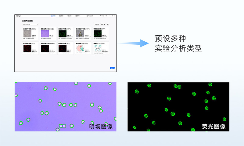 預(yù)設(shè)多種細(xì)胞標(biāo)本AI算法引擎,自動(dòng)分析明場/熒光圖像,精準(zhǔn)識(shí)別目標(biāo)細(xì)胞形態(tài)特征,分析圖像細(xì)胞濃度、活率、直徑等多項(xiàng)指標(biāo)。