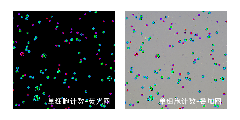 儀器搭載明場(chǎng)+雙色熒光通道,采用 AOPI 熒光染色法。吖啶橙(AO)可透過細(xì)胞膜染色所有核酸,碘化丙啶(PI)僅能進(jìn)入死細(xì)胞或破損細(xì)胞染色核酸,而細(xì)胞核因無完整細(xì)胞膜結(jié)構(gòu),PI 更易滲透,其熒光信號(hào)特征與完整細(xì)胞存在明顯差異。通過對(duì)染色后的細(xì)胞所發(fā)熒光信號(hào)進(jìn)行識(shí)別和分析,能夠精準(zhǔn)區(qū)分單細(xì)胞/單細(xì)胞核、細(xì)胞團(tuán)、碎片等雜質(zhì),減少干擾因素對(duì)檢測(cè)結(jié)果的影響。
